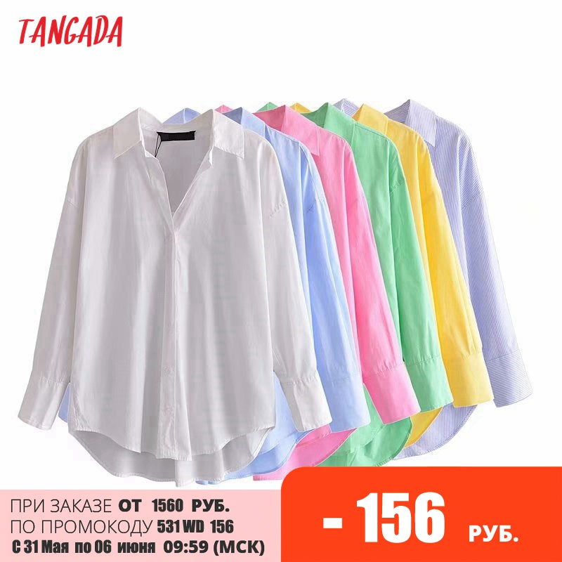 Tangada Women Basic Candy Color Shirts Long Sleeve Solid Turn Down Collar Elegant Office